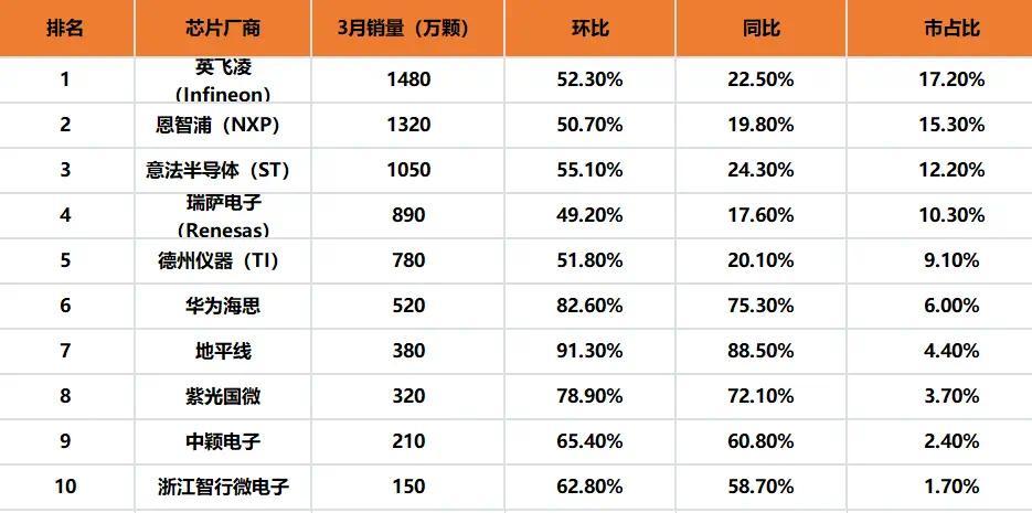 而从具体的厂商销量来看,如上图所示,英飞凌排第一,拿下了17.2%的份额,再是恩智浦、意法半导体、瑞萨电子、德州仪器,前五大品牌都是欧美品牌,合计拿走了65%左右的份额。