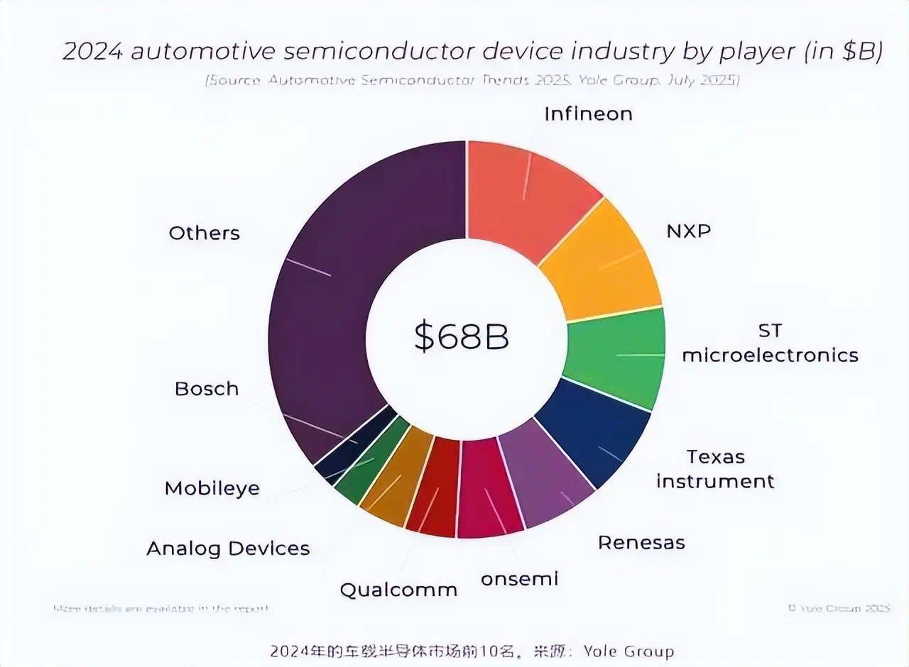 比如下图是2024年汽车芯片市场格局,可以看到英飞凌、恩智浦、意法半导体、德州仪器、瑞萨电子等欧美企业是排在前面的。