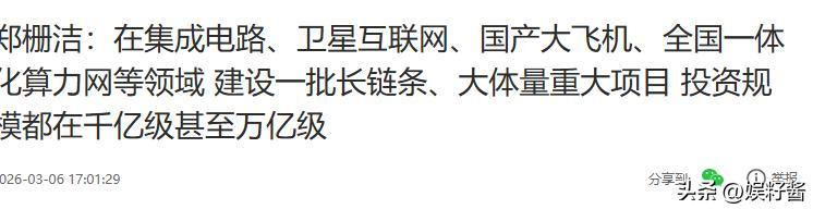 今年3月6日,国家发改委主任郑栅洁在经济主题记者会上透露,我国将在集成电路、卫星互联网、国产大飞机、全国一体化算力网等领域建设一批长链条、大体量的重大项目,投资规模都在千亿级甚至万亿级。什么叫“国之重器”?这就是。